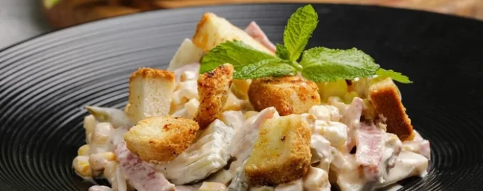 - V solatno skledo dajte šunko, omleto, konzervirano koruzo, kumare, sol in poper, dodajte majonezo in rahlo premešajte.