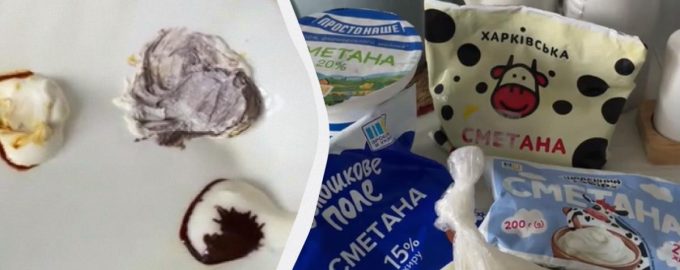 Barva kisle smetane se je začela takoj spreminjati – prvi test so morali opraviti izdelki blagovne znamke “Prostonashe”. Bela barva se je spremenila v rjavo, iz česar je Nutriellaa sklepala, da v kisli smetani ni škroba. Enak rezultat je bil dosežen po testiranju izdelkov blagovnih znamk “Voloshkove Pole” in “Shhodenniy Zbir”. Vendar se zadnja dva vzorca harkovskih proizvajalcev nista pokazala v najboljši luči – “Kharkivska” in tisti, ki je bil kupljen na težo v eni od harkovskih trgovin, obarvan vijolično. Po mnenju avtorja videoposnetka je to neposreden znak, da je proizvajalec v sestavo dodal škrob.