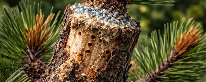 Najprej si natančno oglejte deblo neposredno pod usihajočim delom. Če opazite majhne luknje ali puščajočo smolo, pomešano z žagovino, je drevo napadeno. lubni hrošč ali borovničev hrošč. Te žuželke blokirajo kanale za pretok soka in vrh preprosto preneha prejemati hrano.