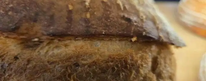 Kruh ima debelo, hrustljavo skorjico in popolno drobtinico.