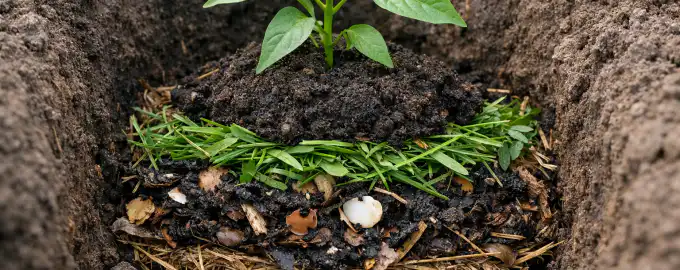 Uporabiti morate prave sestavine, da na dnu jame ustvarite pravo okolje za hranila: – sveže pokošena trava ali koprive – peščica lesnega pepela za razkisanje – nekaj humusa ali zrelega komposta – plast navadne zemlje za izolacijo korenin od gorečih organskih snovi