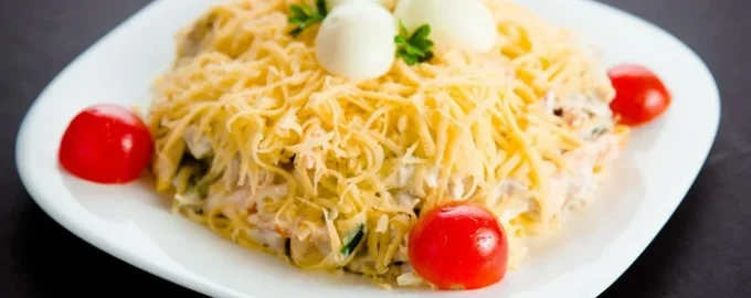 Pripravite obilno solato iz piščančjih jeter, gob, jajc in sira. Ta jed bo kot nalašč za praznično mizo.